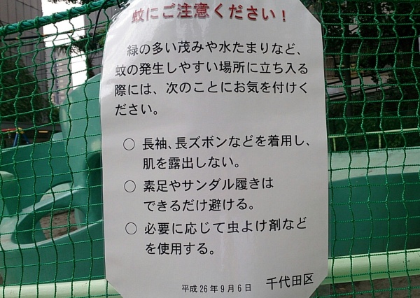 9月6日、厚生労働省より代々木公園・新宿中央公園以外でデング熱に感染したとみられる患者が千代田区外濠公園を訪問したとの連絡がありました。